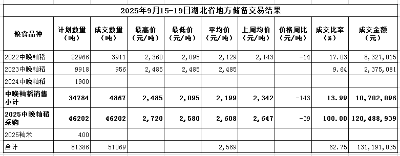 本周湖北地储成交各类粮油51069吨。其中销售:2022年中晚籼稻3911吨,成交率17.03%,成交均价2129/吨,环比下跌14/吨;2023年中晚籼稻956吨,成交率9.64%,成交均价2485/吨。采购:2025年中晚籼稻46202吨,成交率100%,成交均价2608/吨,环比下跌39/吨